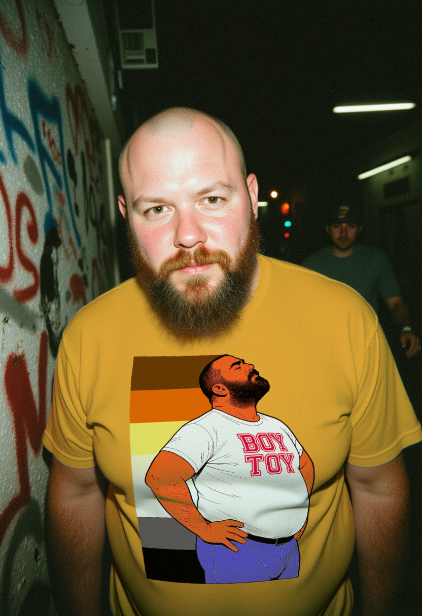Esta camiseta presenta una ilustración potente y descarada: un hombre barbudo, seguro de sí mismo, con camiseta ajustada y mirada altiva, sobre fondo con los colores de la Bear Flag.