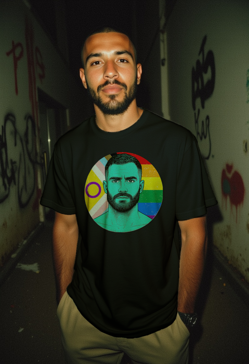Aquí el protagonista es un maromo intensito de piel turquesa que te mira fijo, mientras lleva como fondo la bandera completa: la Progress Pride Flag con el símbolo intersexual bien plantado. Para dejar claro que esto no es moda, es identidad.